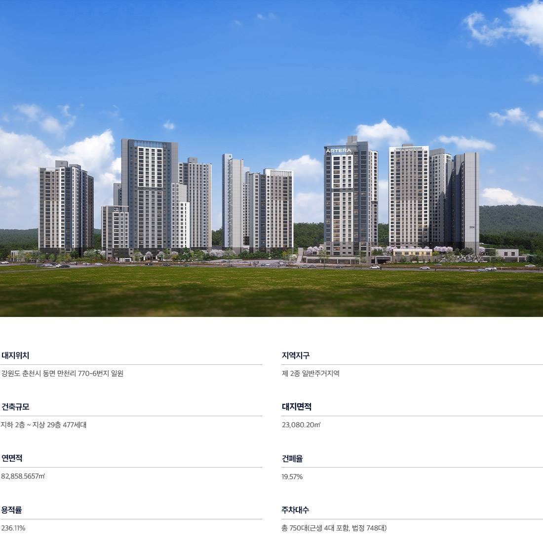 만천초등학교를 품은 안심 학세권 자녀의 안전한 도보 통학이 가능한 교육 중심 단지 단지 바로 앞에 만천초등학교가 위치하며 인근에 후평동 학원가가 밀집해 있어 학부모들이 가장 선호하는 최고의 면학 환경을 갖추고 있습니다. 총 477세대의 고품격 주거 설계 지하 2층부터 최고 29층까지 이어지는 랜드마크 스케일 총 477세대 규모로 조성되며 지하 2층에서 지상 29층까지의 웅장한 높이를 통해 쾌적한 조망과 압도적인 단지 위상을 자랑합니다. 금호건설의 프리미엄 브랜드 아테라 새로운 주거 문화를 선도하는 아테라만의 브랜드 가치 금호건설이 새롭게 론칭한 프리미엄 브랜드 아테라가 적용되어 기존의 주거 공간을 뛰어넘는 고품격 품질과 디자인을 선사합니다. 72㎡에서 116㎡까지 맞춤형 구성 중소형부터 대형까지 아우르는 넉넉한 평면 타입 전용면적 72㎡, 84㎡, 116㎡ 등 다채로운 평형대로 구성되어 다양한 가족 형태에 최적화된 여유로운 생활 공간을 제공합니다. 사통팔달의 편리한 광역 교통망 춘천 IC 및 주요 간선도로 이용이 편리한 입지 춘천 IC와 인접하여 서울 및 타 지역 이동이 빠르며 춘천 순환로를 통해 도심 내 주요 거점으로의 이동이 매우 용이한 최적의 교통을 갖췄습니다. 후평동 인프라를 누리는 생활권 쇼핑, 의료, 문화 시설이 집결된 풍부한 편의 시설 인근의 대형 마트와 병원, 관공서 등 후평동의 기성 인프라를 그대로 공유하여 입주 즉시 완벽하고 편리한 생활 환경을 누릴 수 있습니다. 만천리 신흥 주거타운의 비전 지속적인 개발과 대단지 형성에 따른 미래 가치 만천리 일대의 대규모 주거 개발 사업과 연계되어 미래가 더 기대되는 춘천의 새로운 중심 주거 단지로 거듭납니다.